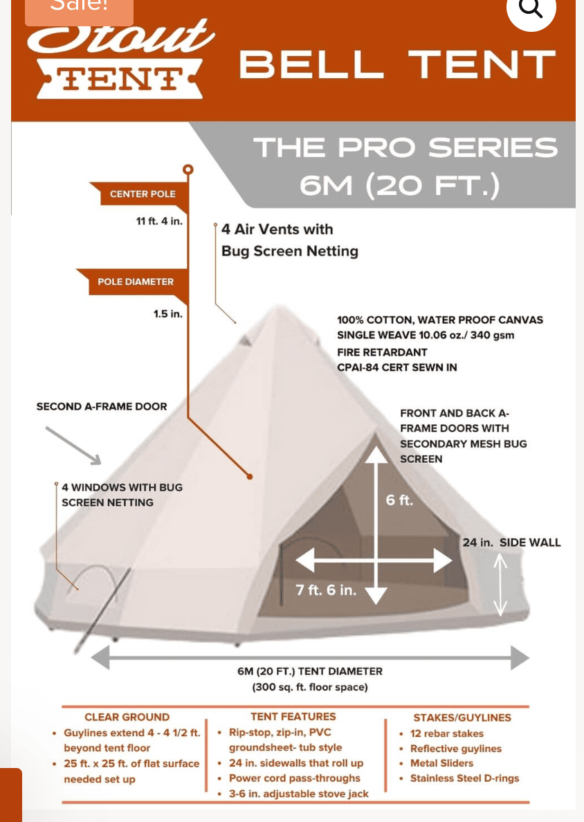 Stout makes great Bell Tents. Here is a video of the 5M (16' diameter) I installed in 2021. I enjoyed the tent and the service so much I applied to be an affiliate. The first link below offers a discount and the second link is the YouTube video of my install.